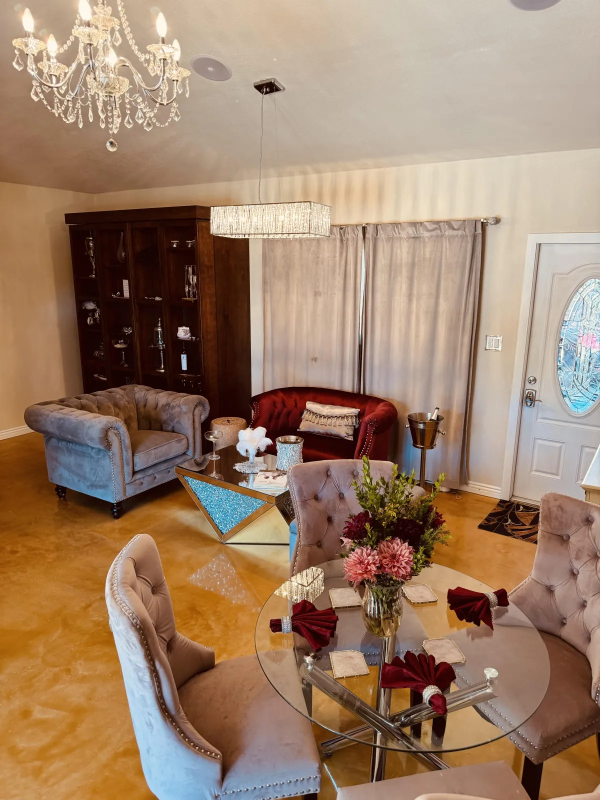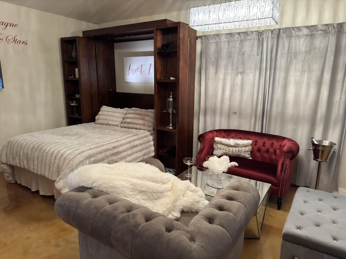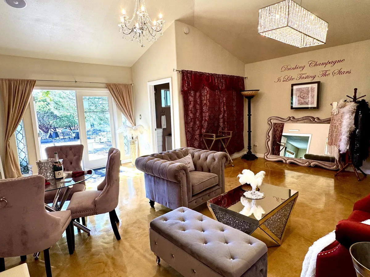 The Champagne Room is a 1920s-inspired space designed to remind you of something many people forget: life is meant to be celebrated. Velvet couches, chandeliers, and a gold floor evoke the feeling of standing inside a glass of champagne — a deliberate choice meant to reawaken joy, beauty, and a sense of occasion. Many guests share that simply being in this space begins shifting how they feel about themselves and their lives.