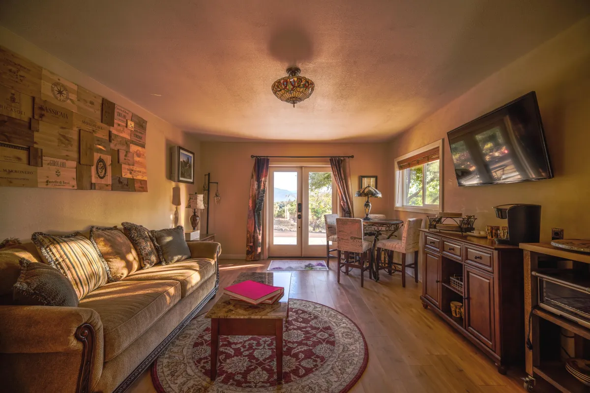 Both rooms include queen beds and their own dining tables, intentionally placed for evening reflection and quiet morning journaling. A shared living space and kitchenette are fully stocked with a mini-oven, Keurig for tea or coffee, and a curated selection of drinks and snacks — so nothing pulls you back into “normal life” while you’re here.